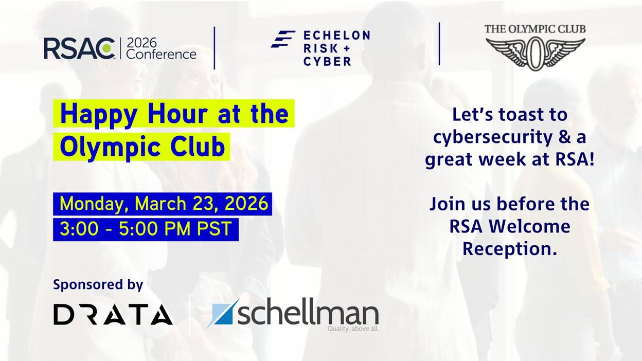 Join Echelon Risk + Cyber for our annual RSA Happy Hour at The Olympic Club on Monday, March 23, from 3:00–5:00 PM PT, just before the official RSA Welcome Reception, with our sponsors Drata and Schellman!