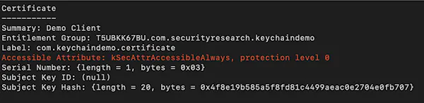 This was it! The client certificate was stored in Keychain, and its accessible attribute was set to “kSecAttrAccessibleAlways,” which meant the item was accessible even when the device was locked (a bad security practice).