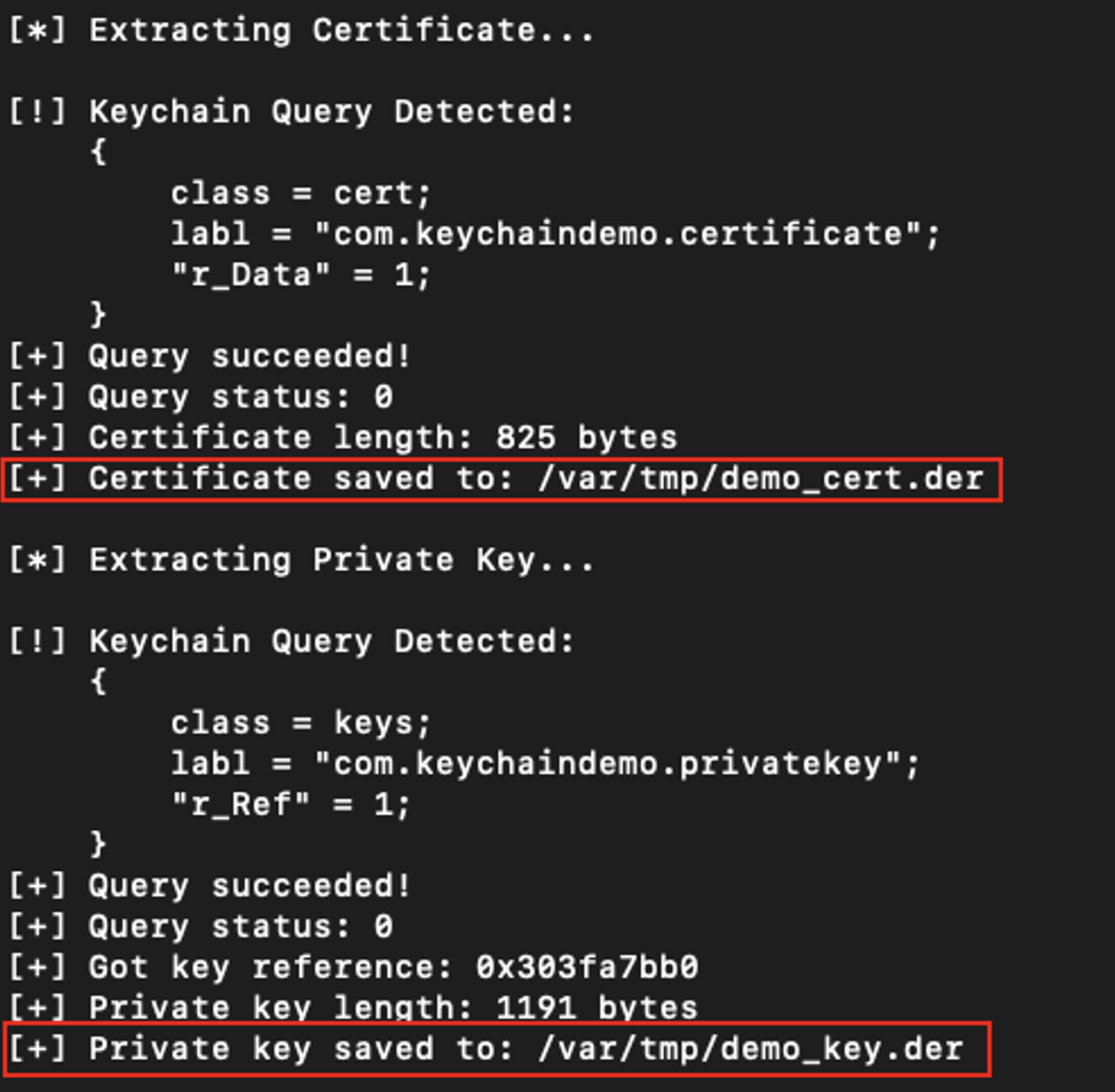 I could confirm that every time the application sent an HTTPS request to the backend server, the certificate and private key were retrieved. So I modified the Frida script to save both of them. Saving the certificate was straight forward: the function “SecItemCopyMatching” returned a pointer to the plaintext certificate. Saving the private key required the use of the “SecKeyCopyExternalRepresentation” function, which is part of the iOS Security framework, to copy the plaintext key.