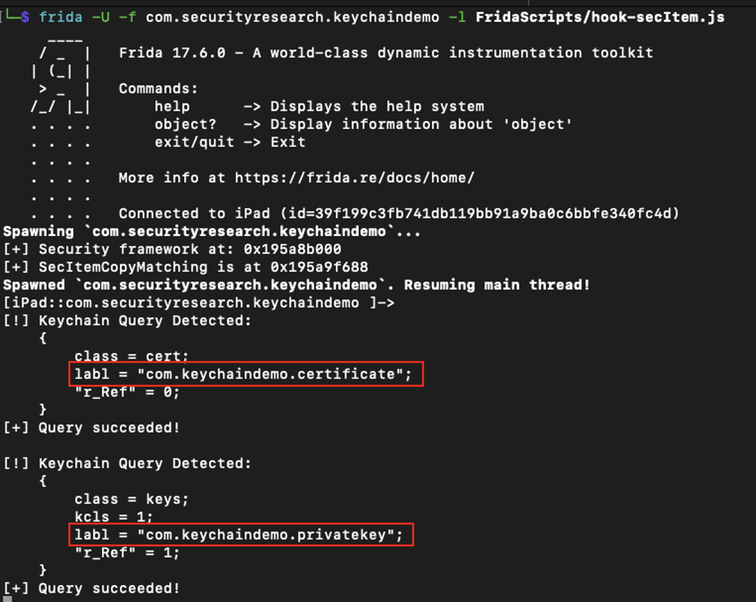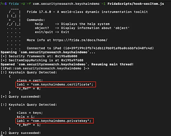 Now, I was missing the second piece of the puzzle, the private key. “Keychain-dumper” was throwing an error because it couldn’t find “openssl” in “/usr/bin,” and because of the rootless jailbreak, “/usr/bin” was read-only. So I decided to use the Frida framework and wrote a script to hook the function “SecItemCopyMatching.” This function is part of the iOS Security framework and is used to read items from the Keychain. This way, I could easily get the certificate and private key when the application retrieved them.