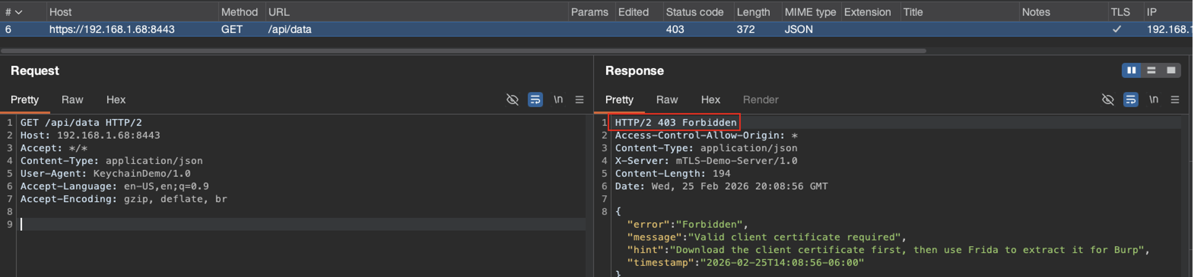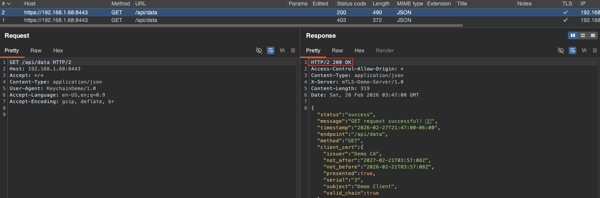 After completing it, I was able to sign the client’s request, establish full mTLS communication, and intercept HTTPS traffic. I knew it worked because the server responses had 200 status codes and included the API data.