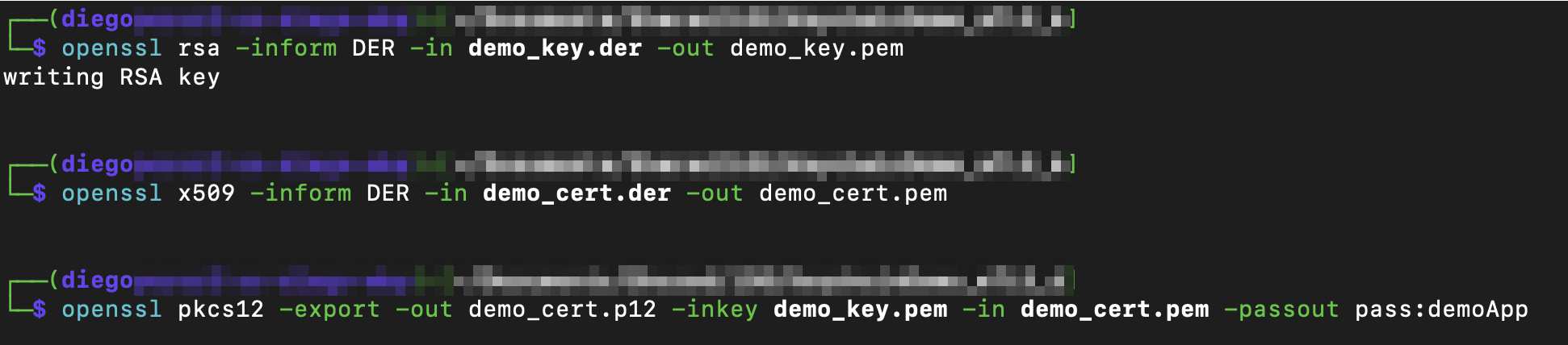 I transferred the files to my computer and used “openssl” to convert them to a format that Burp could handle. The first step was to convert both to PEM format. Then bundle them into a PKCS#12 file; for this demo, I set the password to “demoApp,” but it’s not mandatory.