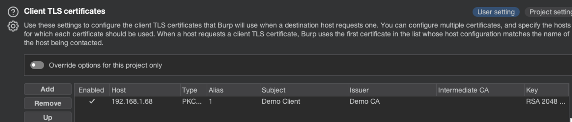 Then, I imported the file into Burp. This can be done from the Proxy settings > Network > TLS > Client TLS certificates.